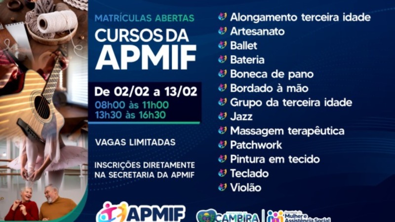 A Associação de Proteção à Maternidade à Infância e à Família (APMIF) de Cambira está com matrículas abertas para diversos cursos gratuitos voltados à comunidade. As inscrições acontecem até o dia 13 de fevereiro, diretamente na Secretaria da APMIF, com vagas limitadas.