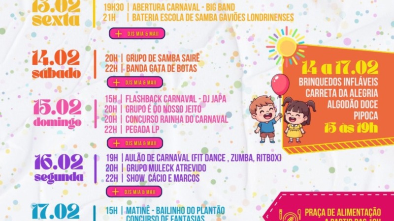 A abertura, nessa sexta-feira (13), começa às 19h30 com a apresentação da Big Band Maestro Canindé, seguida pela bateria da escola de samba Gaviões Londrinenses, marcando o início oficial da folia com muito ritmo e tradição. Ao longo do evento, os intervalos entre as atrações serão animados pelas DJs Mia e Maii, garantindo o clima de carnaval do início ao fim.